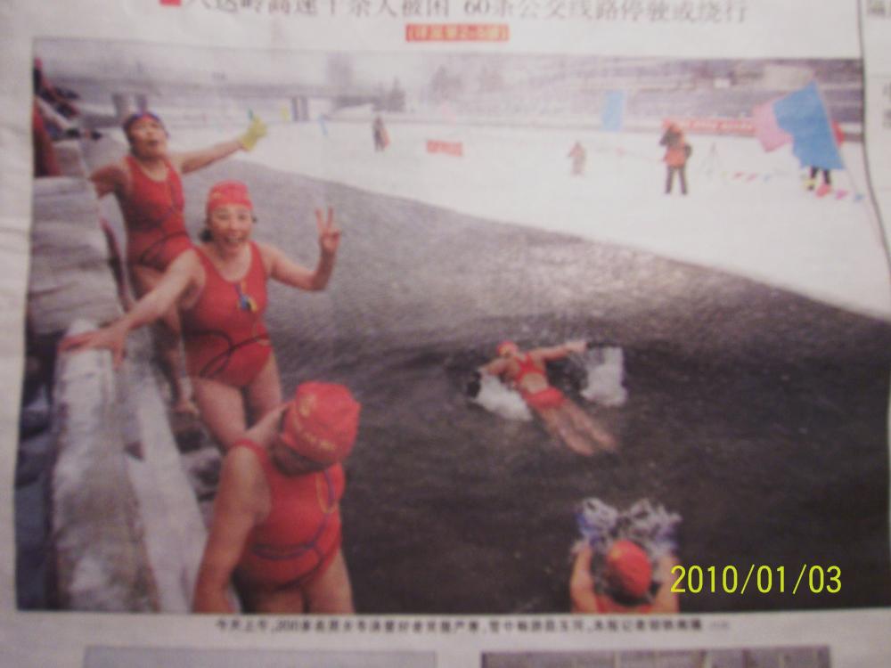 这是今天报纸上的一张照片,内容是:“今天上午200多名冬泳爱好者笑傲严寒,雪中畅游... ” 她们可真棒!