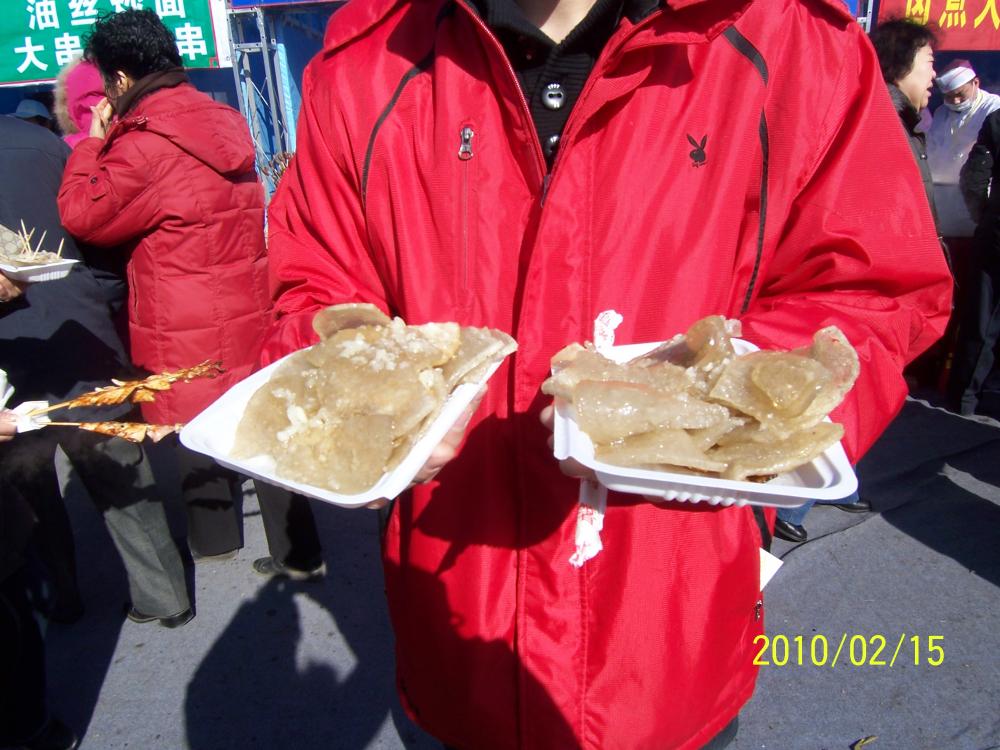 北京小吃--灌肠,说是肠,其实是用淀粉做成肠状,上锅蒸熟,切成片用油煎后浇上盐水蒜汁,用牙签扎着吃,外焦里嫩